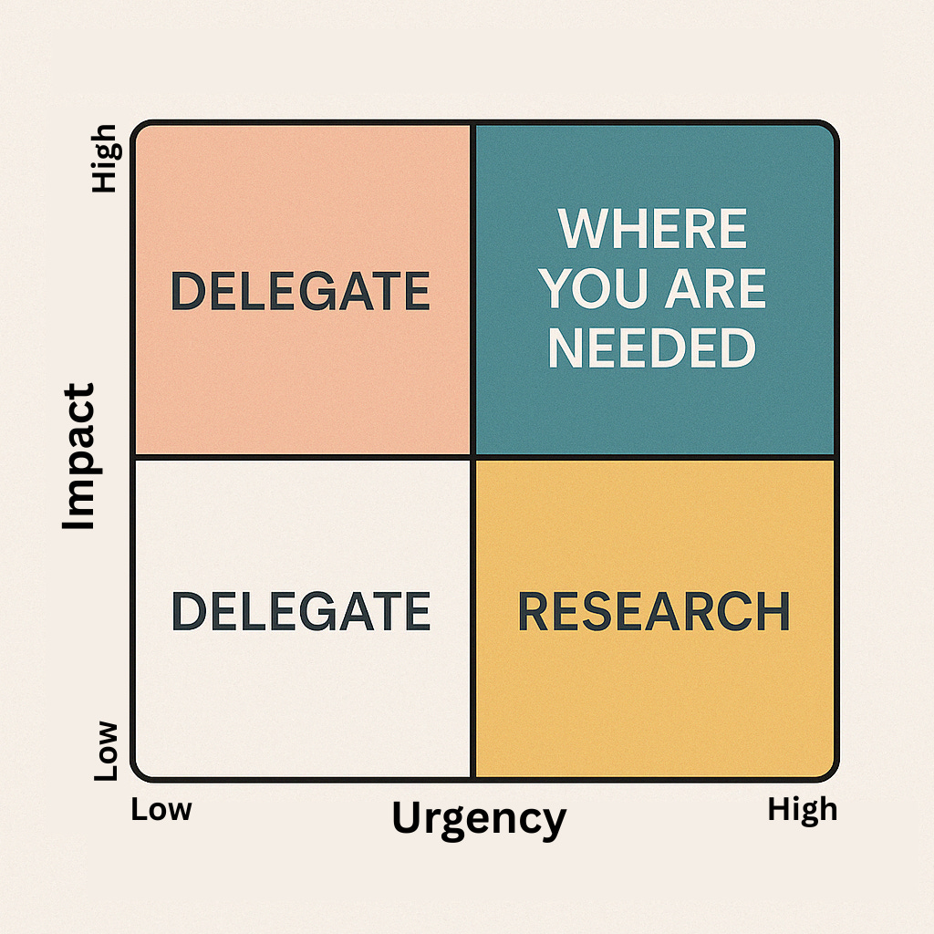 To help me with this, I use a simple mental 2×2 prioritization matrix, inspired by Eisenhower’s own, to quickly assess in which bucket the decision coming to you is falling.